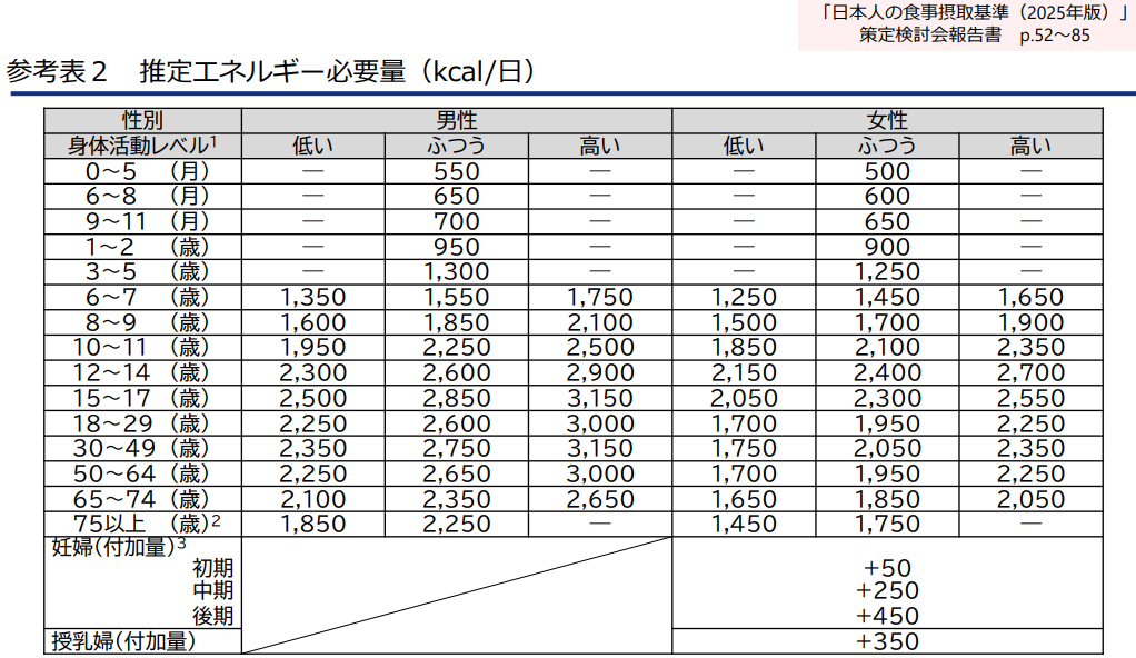 2025年版では、妊娠初期+50kcal、中期250kcal、後期+450kcal、授乳期+350kcalとなっていますので、ご確認お願い致します。